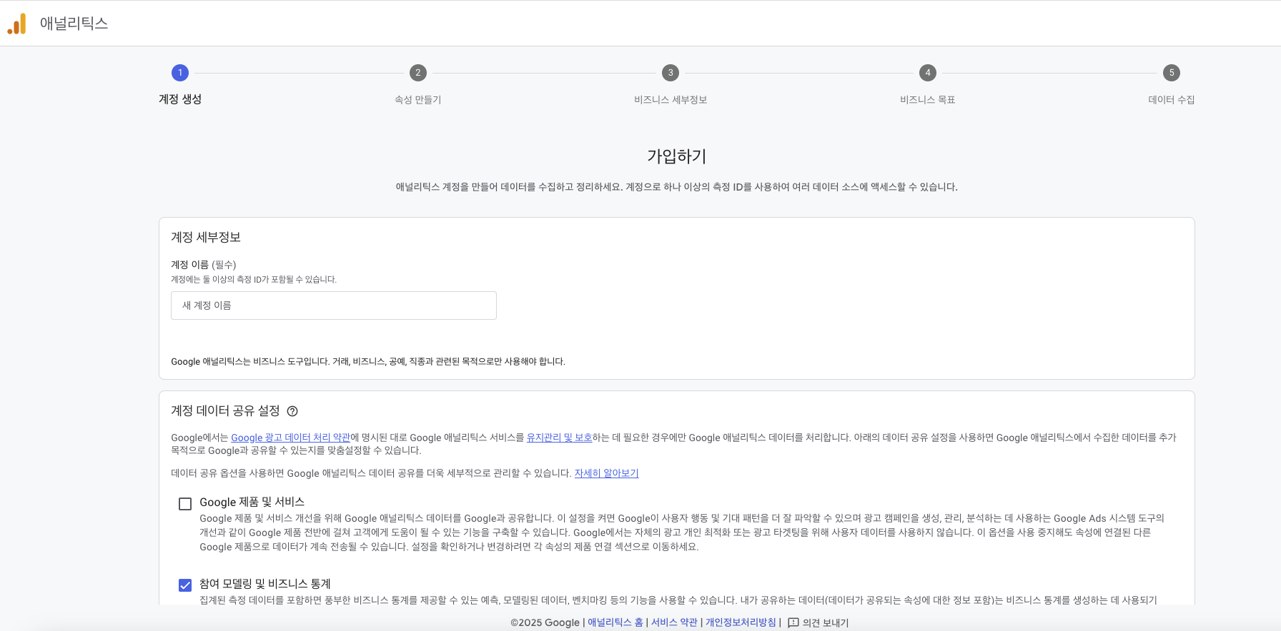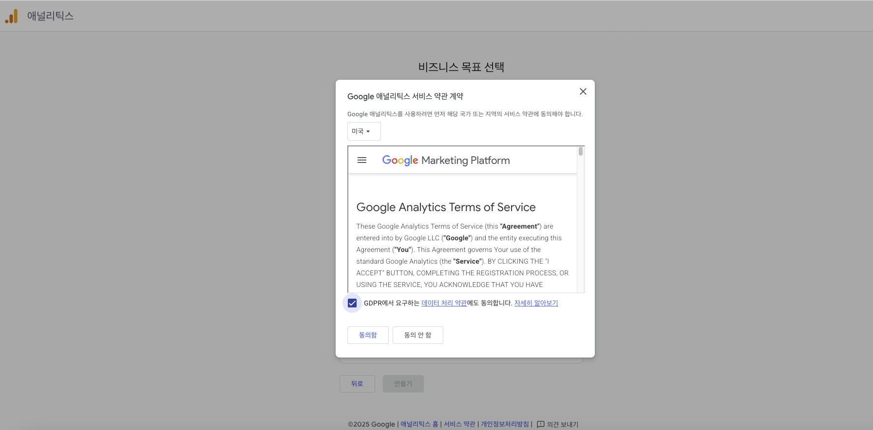 구글 애널리틱스 서비스 약관 동의함을 눌러서 계속 진행합니다.