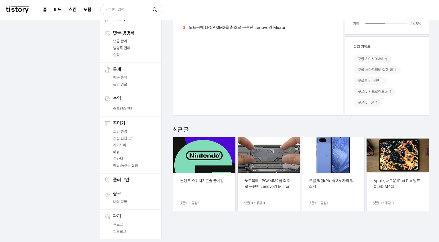 이제 티스토리 블로그에 들어오는 유저들의 데이터를 측정할 수 있겠죠.