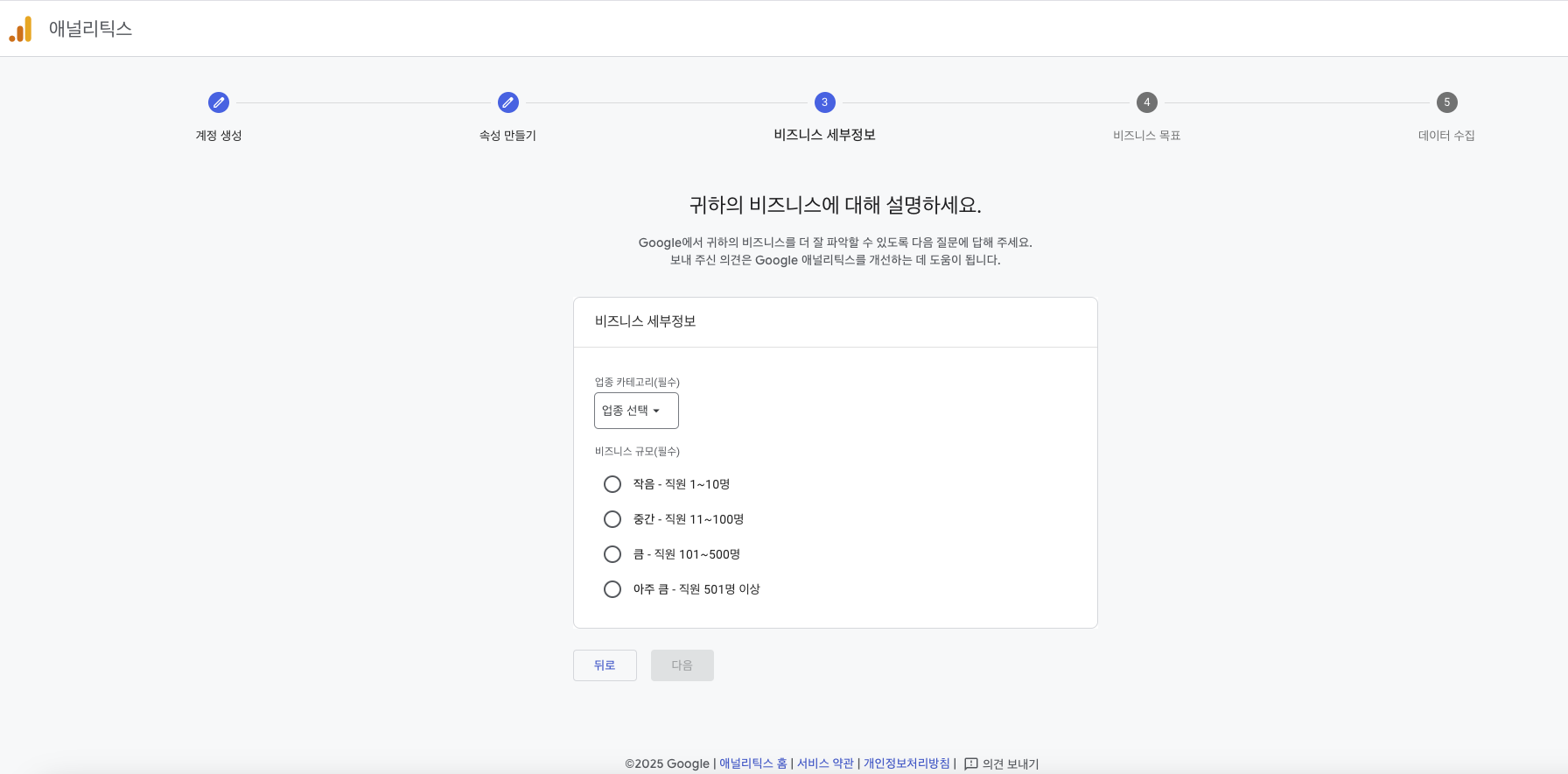 비즈니스 세부정보, 업종을 랜덤하게 선택하고, 규모는 작음으로 했습니다.