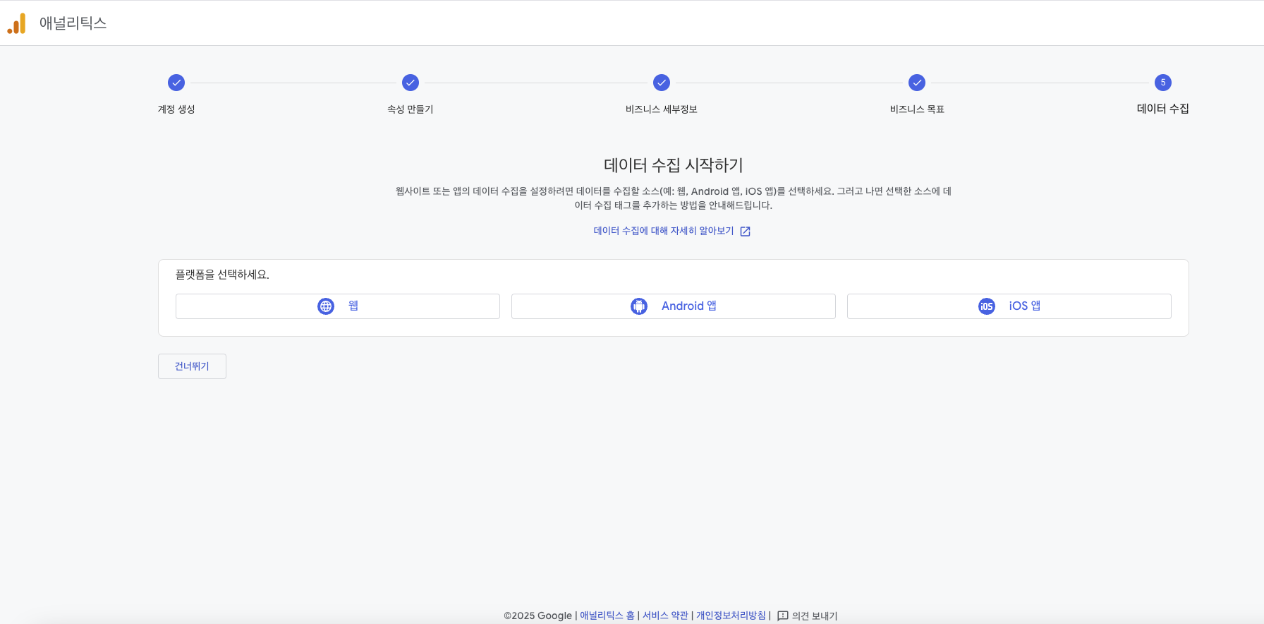 데이터 수집 시작하기 탭에서 웹, 안드로이드 앱, iOS 앱 중 선택할 수 있는데요.