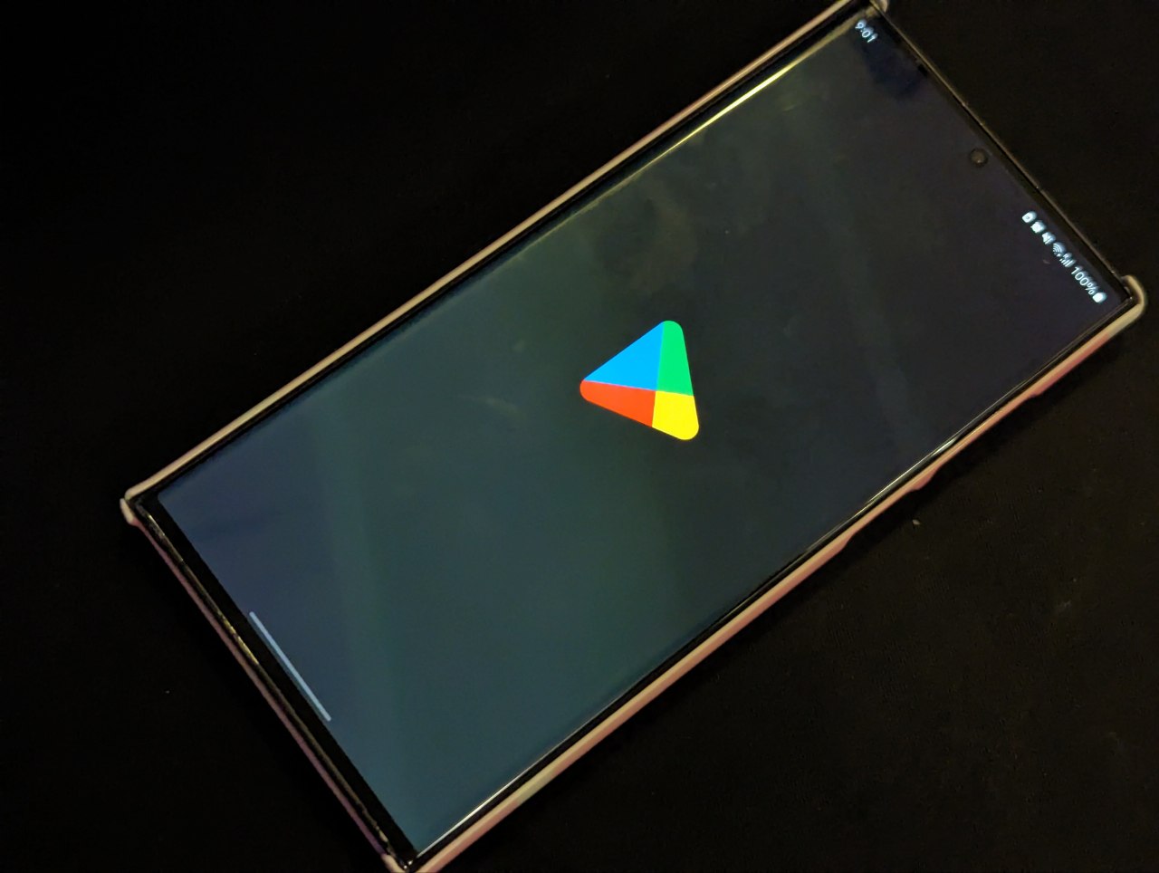 누군가 삼성 갤럭시 S23 FE를 들고 있는 동안 Google Play 스토어가 표시됩니다.