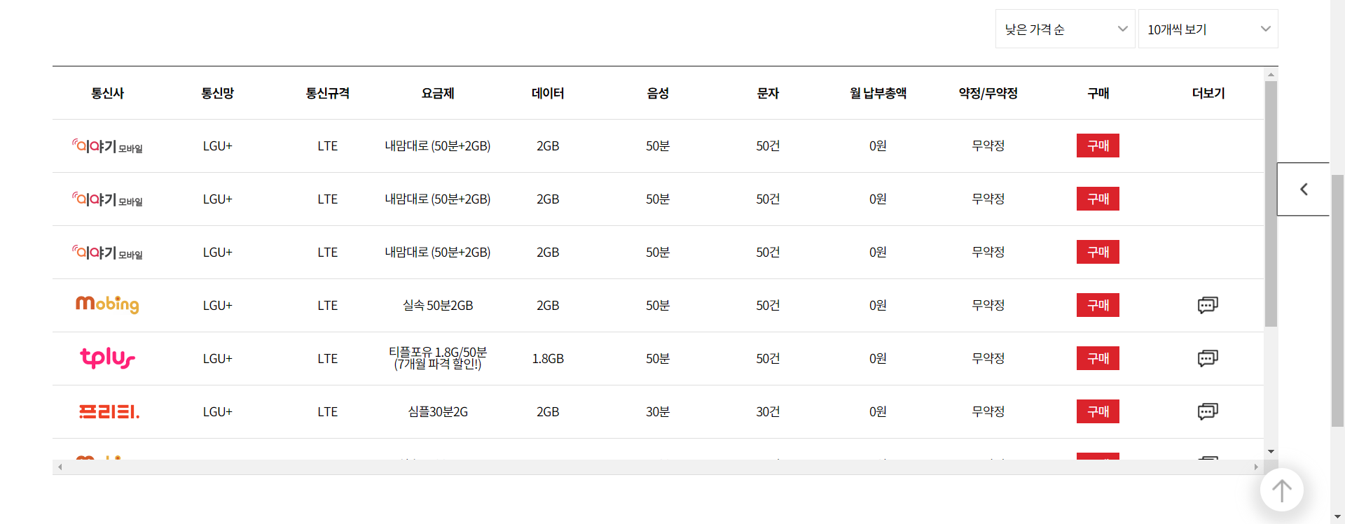 조건을 선택하지 않고 무조건 최저가로 검색하니 0원대 이벤트 요금제들도 많았습니다.