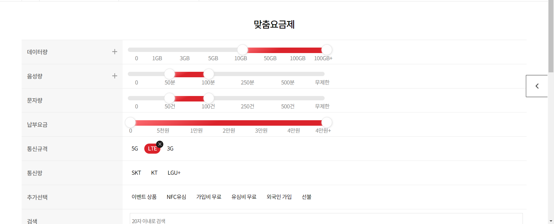 맞춤요금제 검색 화면에서 본인이 사용할 통화/문자/데이터 양을 선택하면 됩니다.