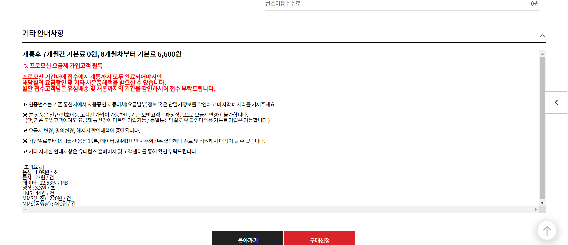 안내사항을 읽어보면 기본료 0원, 8개월차부터 기본료가 6,600원씩 청구되는 요금제임을 알 수 있습니다.